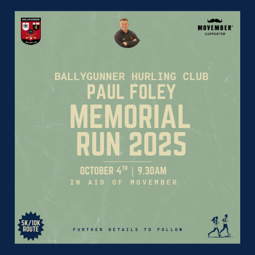 Ballygunner GAA are hosting the ‘Paul Foley Memorial Run’ in October in honour of their beloved former clubmate and friend, Paul Foley. The club will be raising funds for Movember and would welcome your support.
